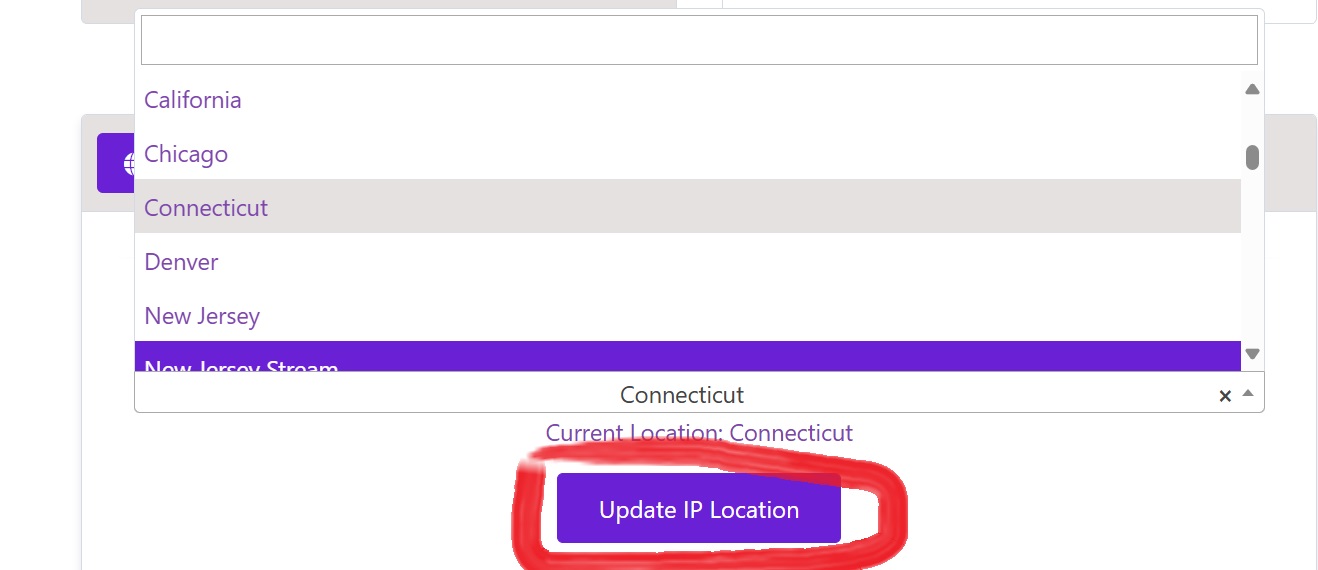 STEP 3 : Scroll down to manage service. Pick Your Desired Location From The Drop Down And Click Update IP Location